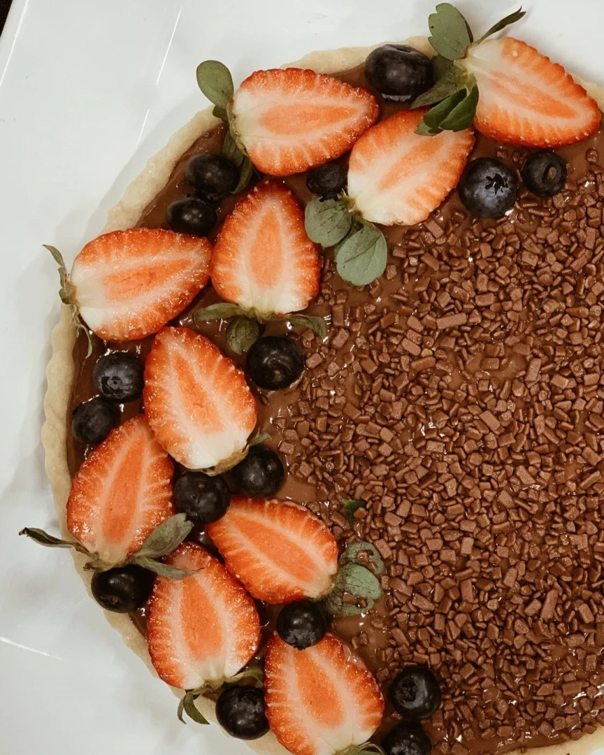 Torta de Chocolate Trufada: massa sablé tradicional, recheio cremoso de chocolate trufado com creme de avelã, finalizada com morangos e blueberries frescos