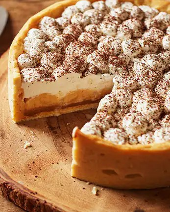 Banoffee Clássica: base crocante de massa amanteigada, recheio de doce de leite cremoso, bananas frescas e cobertura de chantilly suave, finalizada com um toque de chocolate.